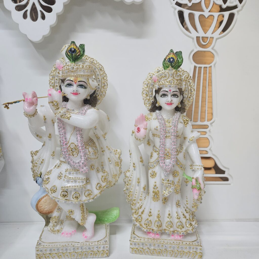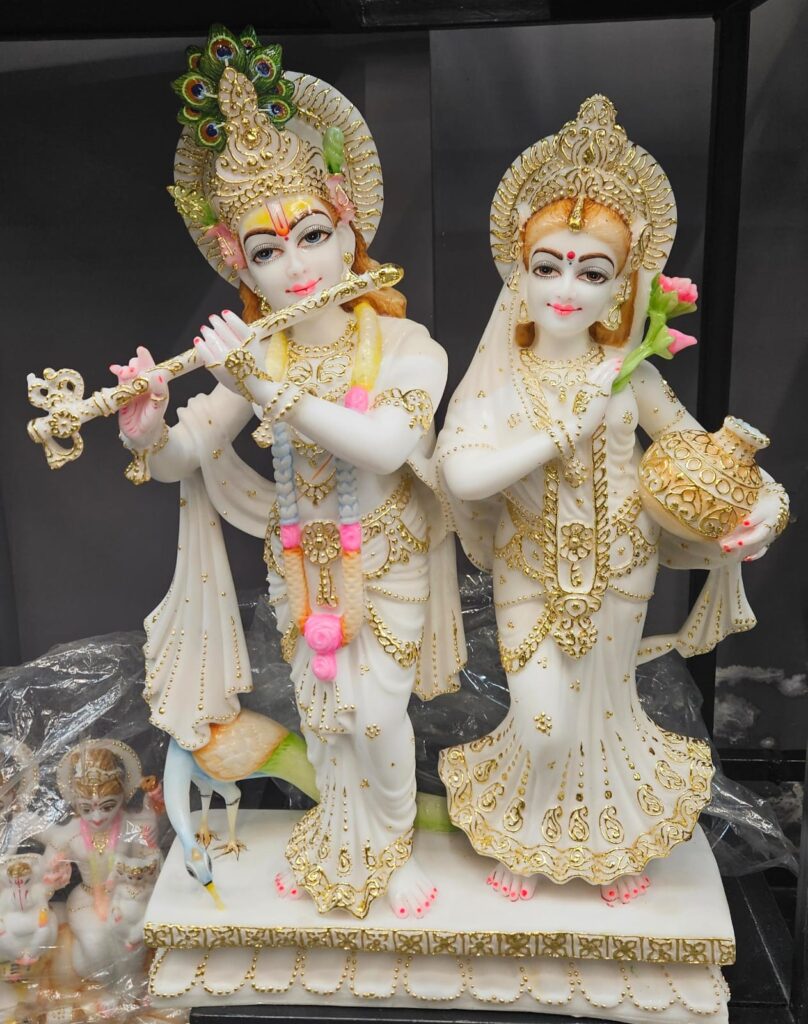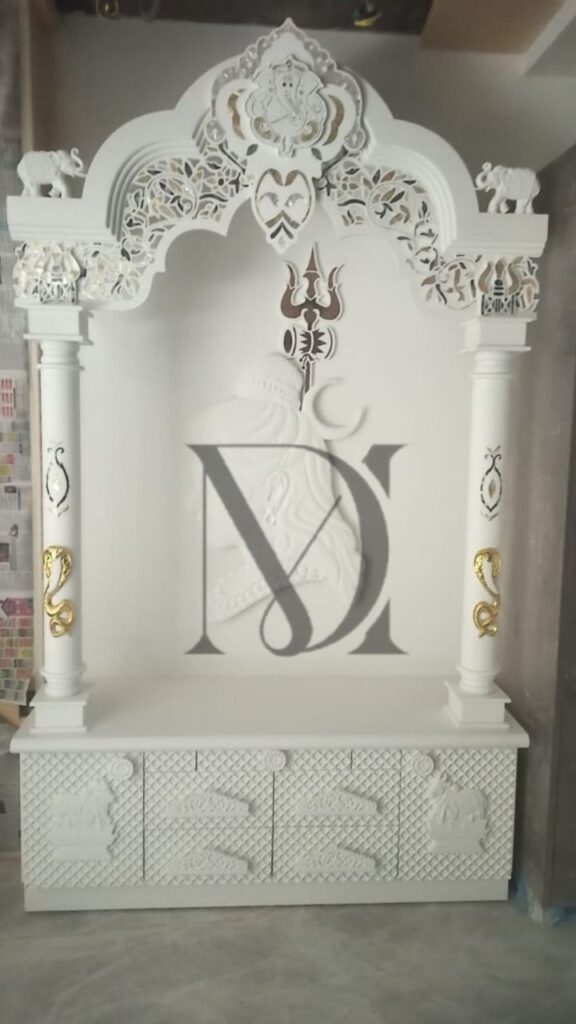A premium Corian mandir enhanced with elegant golden columns and detailed carvings. Designed to be the focal point of your pooja space, it adds grandeur and divine elegance to your home.