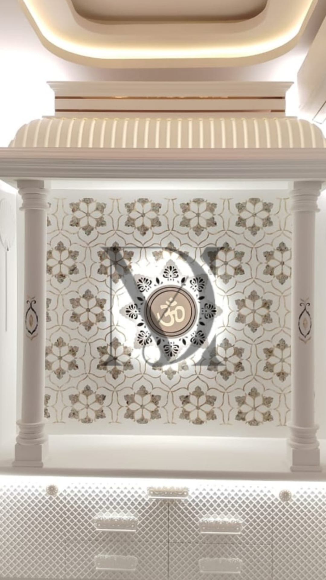 Crafted in premium white Corian, this mandir features intricate carving with soft backlighting that creates a peaceful spiritual ambience. Its seamless finish and modern design make it perfect for contemporary homes.
