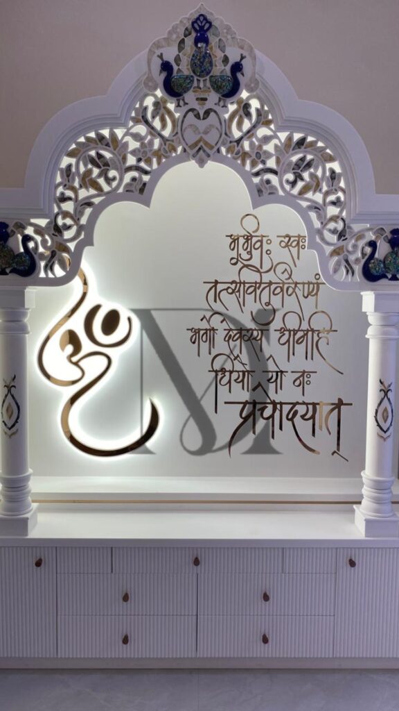 A beautifully designed Corian mandir showcasing an artistic Om motif with glowing illumination. The clean lines and minimal detailing bring a perfect balance of tradition and modern aesthetics.
