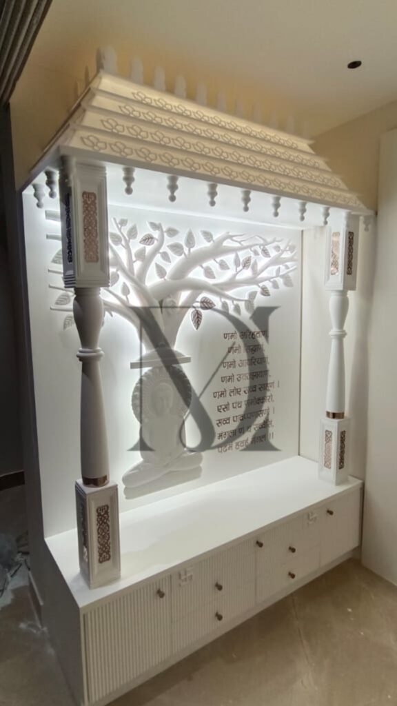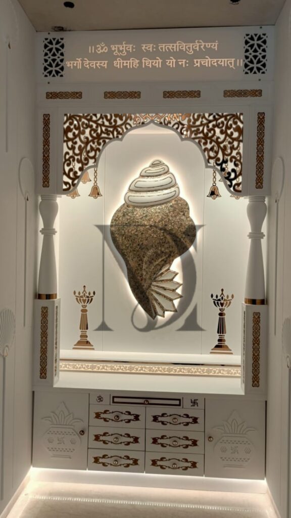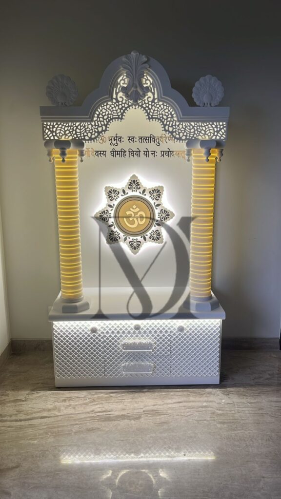 This designer Corian mandir blends traditional Indian craftsmanship with modern materials. Decorative patterns, premium lighting, and storage drawers make it both spiritual and functional.